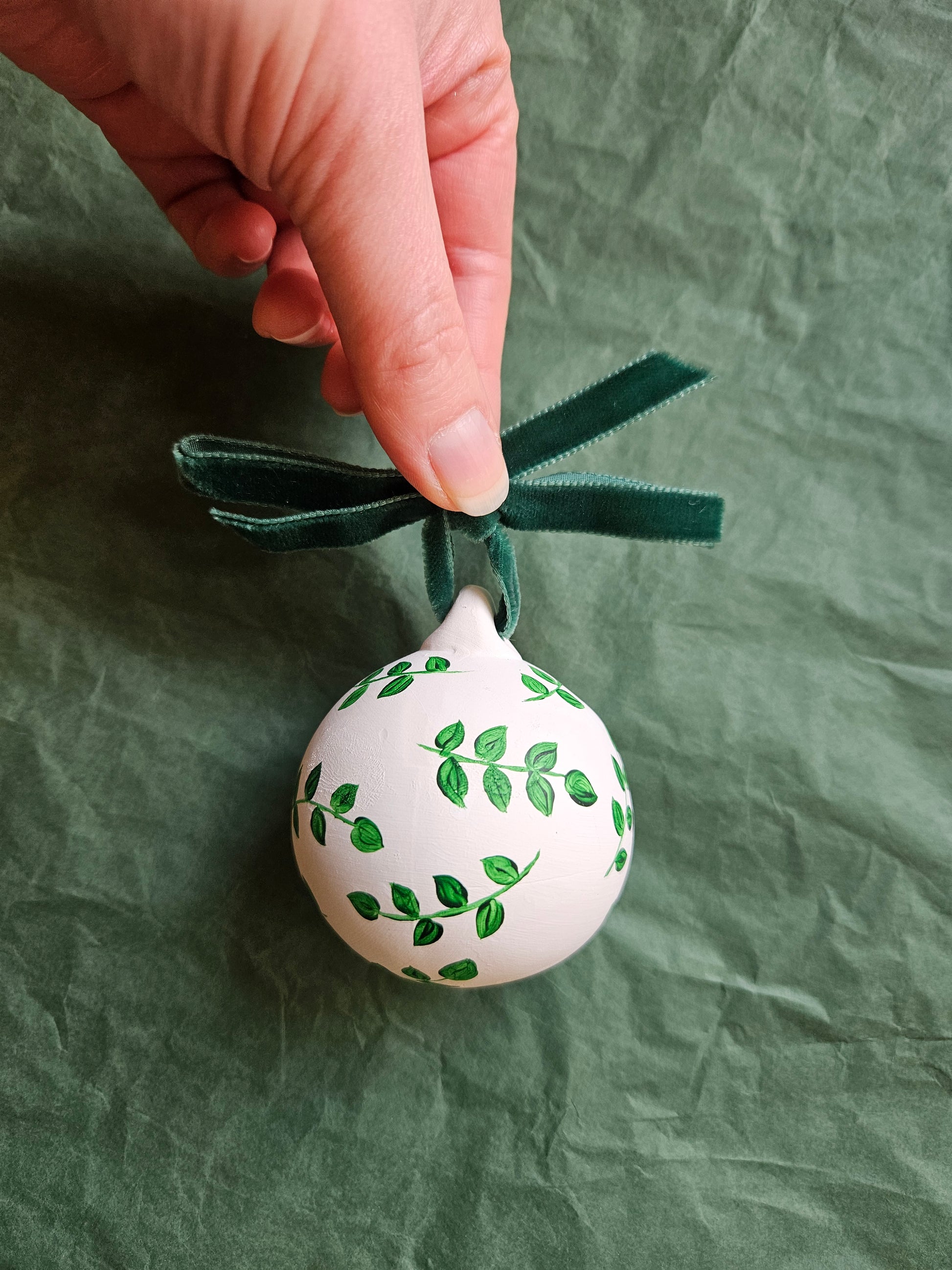 - White Ceramic Bauble with Green Leaves: This clean, white ceramic bauble features hand-painted green leaves, adding a fresh, nature-inspired look to your Christmas tree decorations.