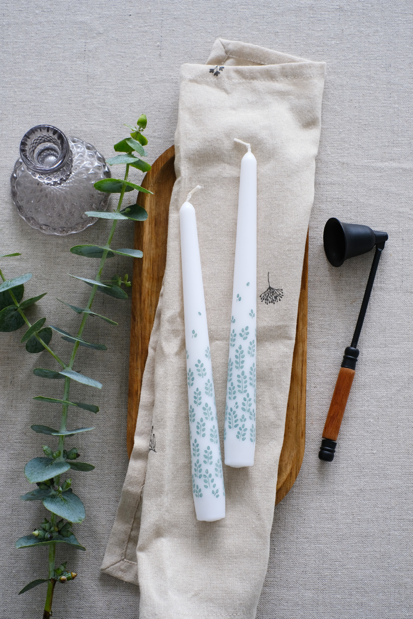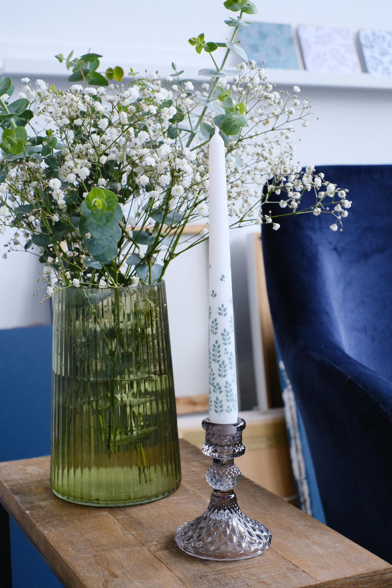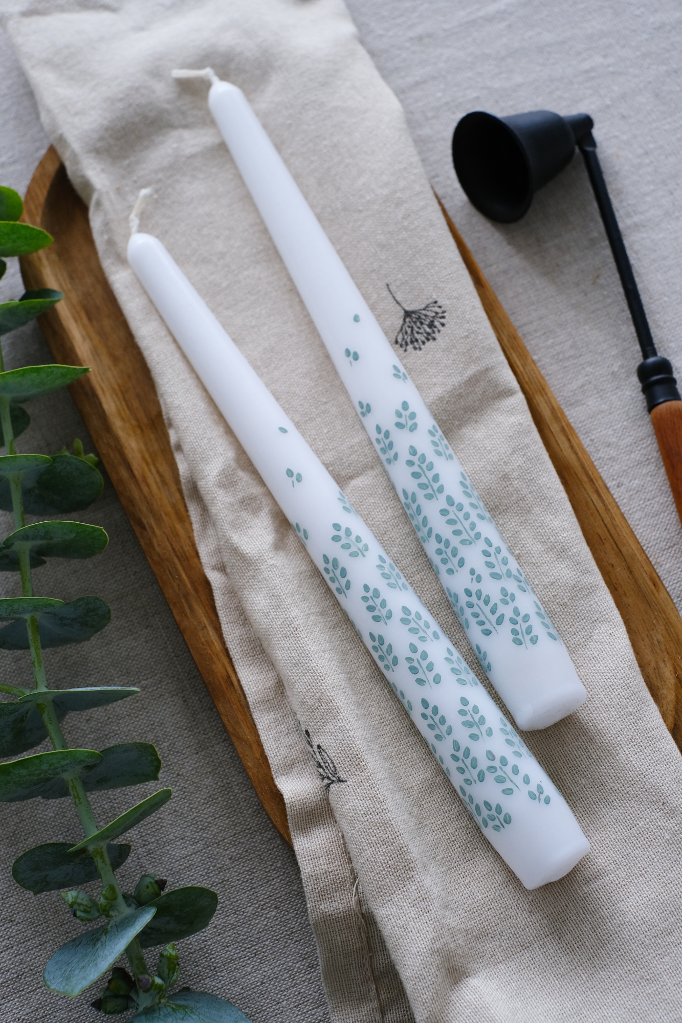 Painted using a water based non-toxic paint, the 10 inch tapered candles are safe to light, with a minimum 7hr burn time.