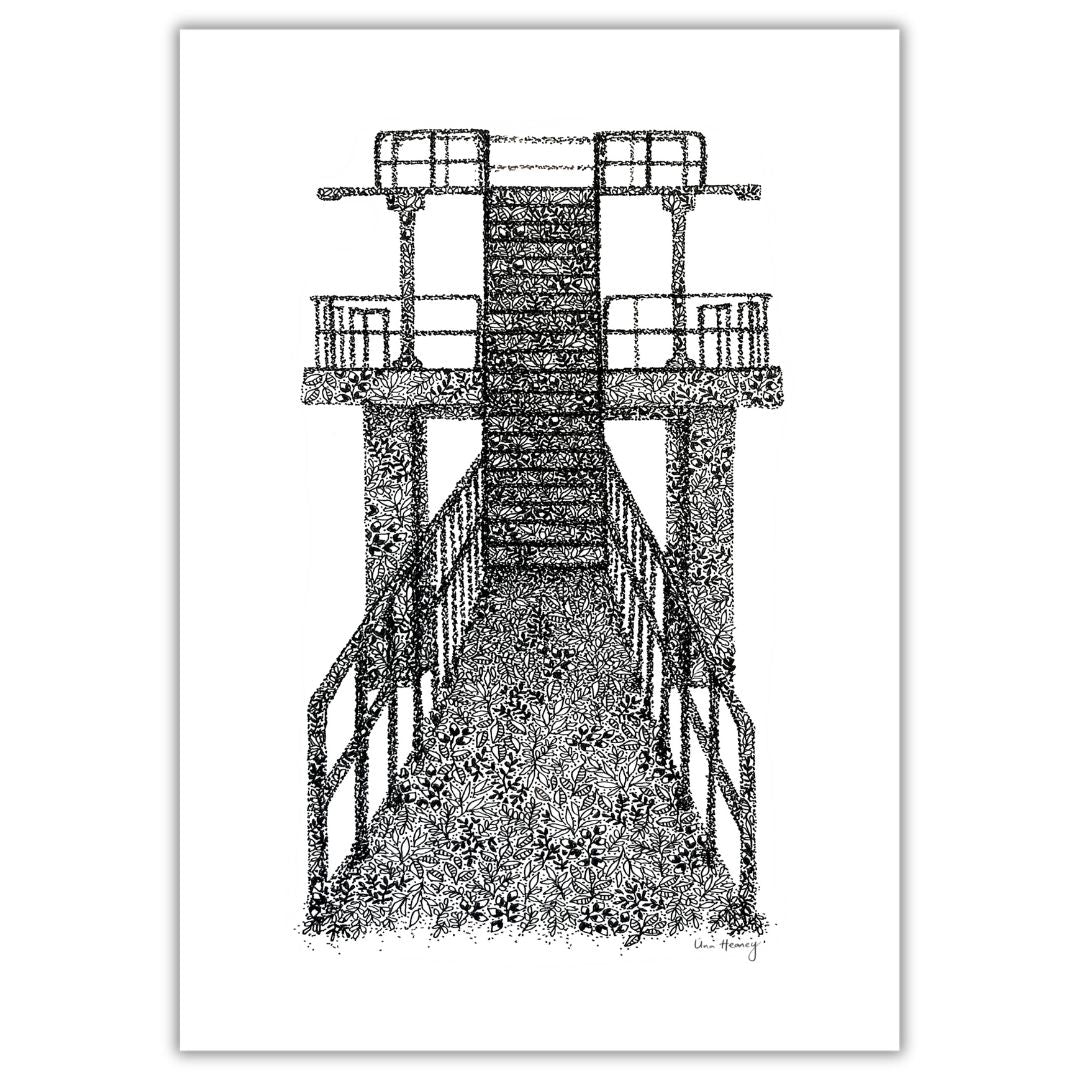 If you've "takin' a whirl 'round the salthill prom" you'll know the iconic Galway landmark - Blackrock Diving Board in Salthill. Often photographed from the side, our illustration is the view you get as you walk up those steps to take the plunge into Galway Bay. During the Summer, Blackrock is filled to the brim with people diving off here, enjoying the view across to the Burren, and taking advantage of the Wild Atlantic Way. During the Winter months, you'll see sea swimmers dotting the shoreline sharing stories, coffee and a shared love. Our print is a special momento of a special place, one that's not just a location, but an experience.