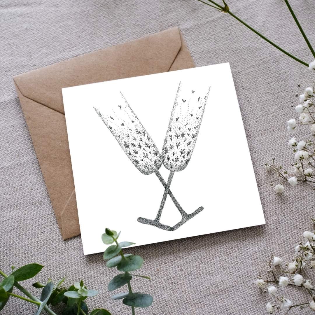 Our Champagne Glasses card is one of our bestsellers and when you hold this in your hand you'll see why. The tiny delicate detail is beautiful against the crisp white of the card. Customers love it for engagements and weddings, or any champagne inducing celebration really!
