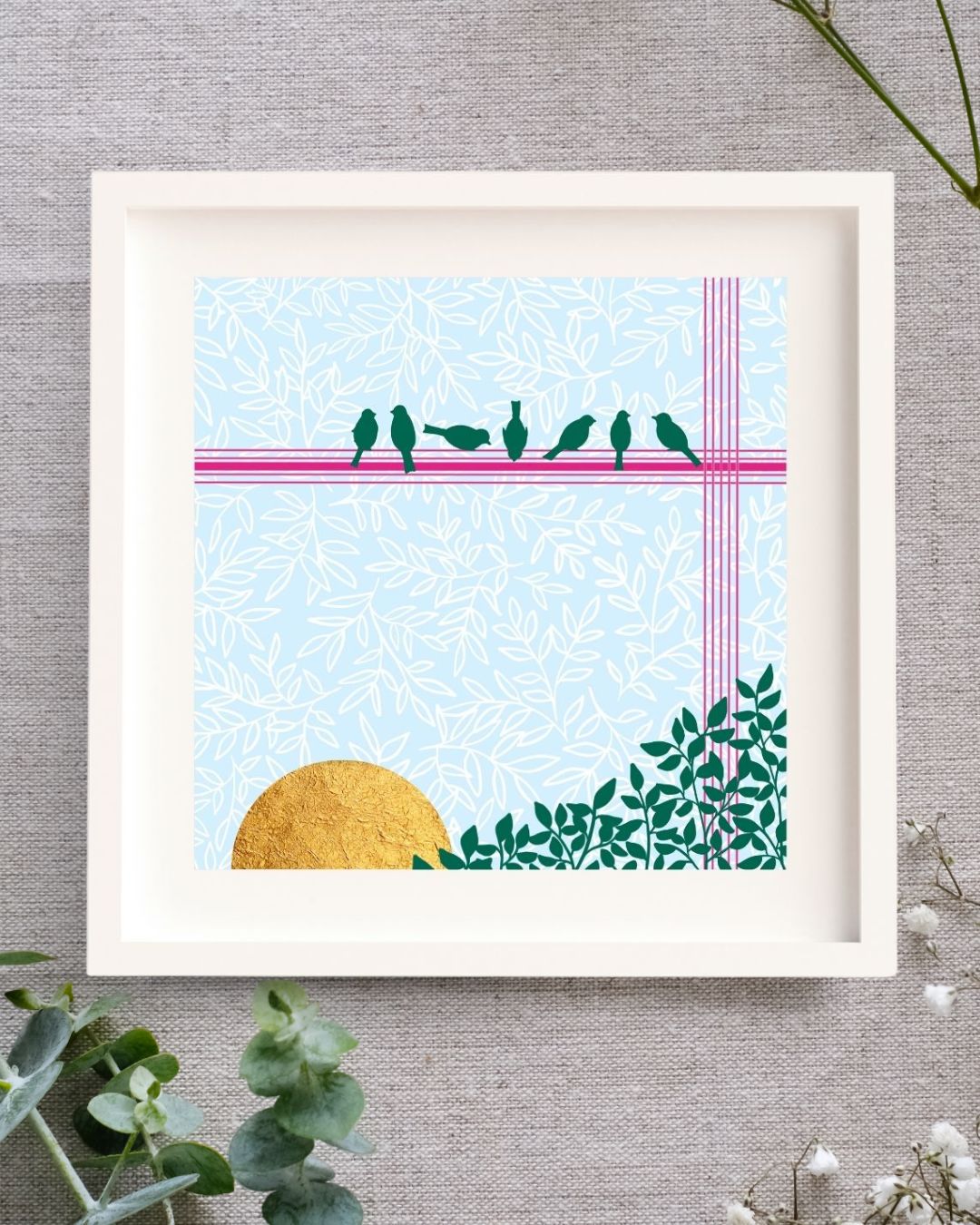 Dawn Chorus, is a limited edition print, hand finished with gold leaf, and signed by the artist Úna Heaney.