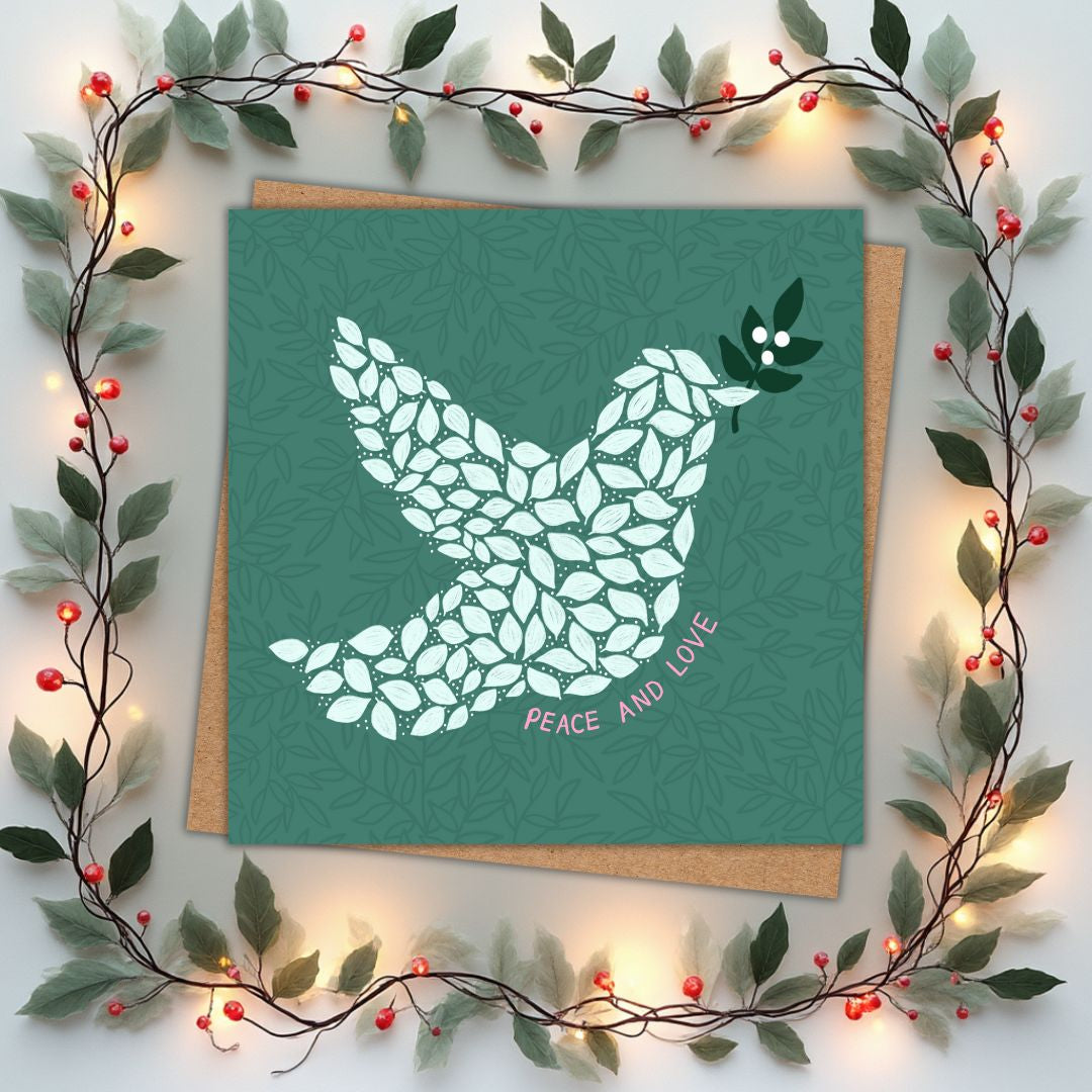 A beautiful peaceful sentiment to send to your friends and family this Christmas, our Peace and Love card is illustrated by hand in a mixture of lovely green tones, with a touch of pink.